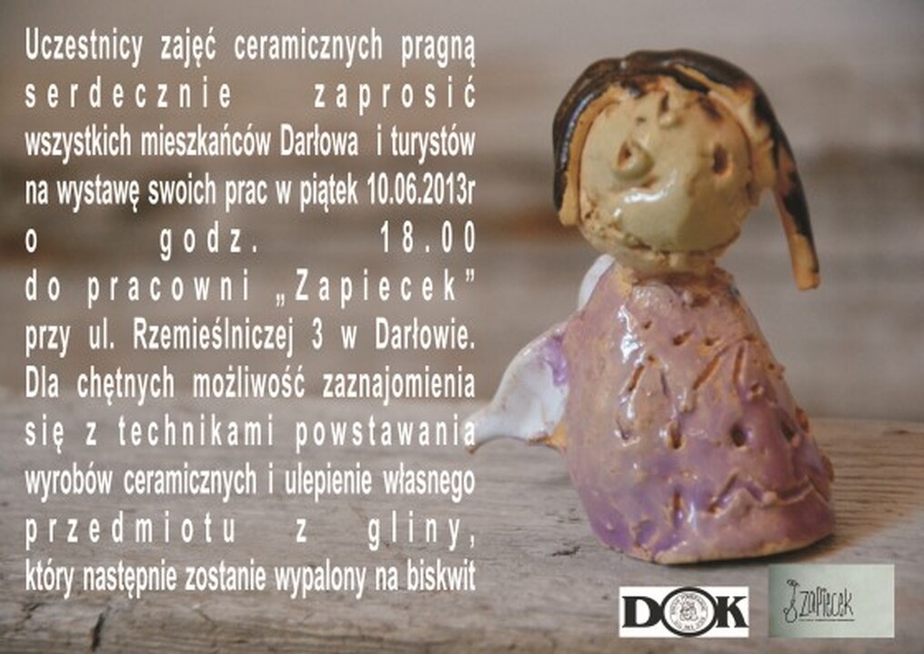 Uczestnicy zajęć ceramicznych pragną serdecznie zaprosić wszystkich mieszkańców Darłowa i turystów na wystawę swoich prac w piątek 10.06.2013 r. o godz. 18.00 do pracowni "Zapiecek" przy ul. Rzemieślniczej 3 w Darłowie. Dla chętnych możliwość zaznajomienia się z technikami powstawania wyrobów ceramicznych i ulepienie własnego przedmiotu z gliny, który następnie zostanie wypalony na biskwit.