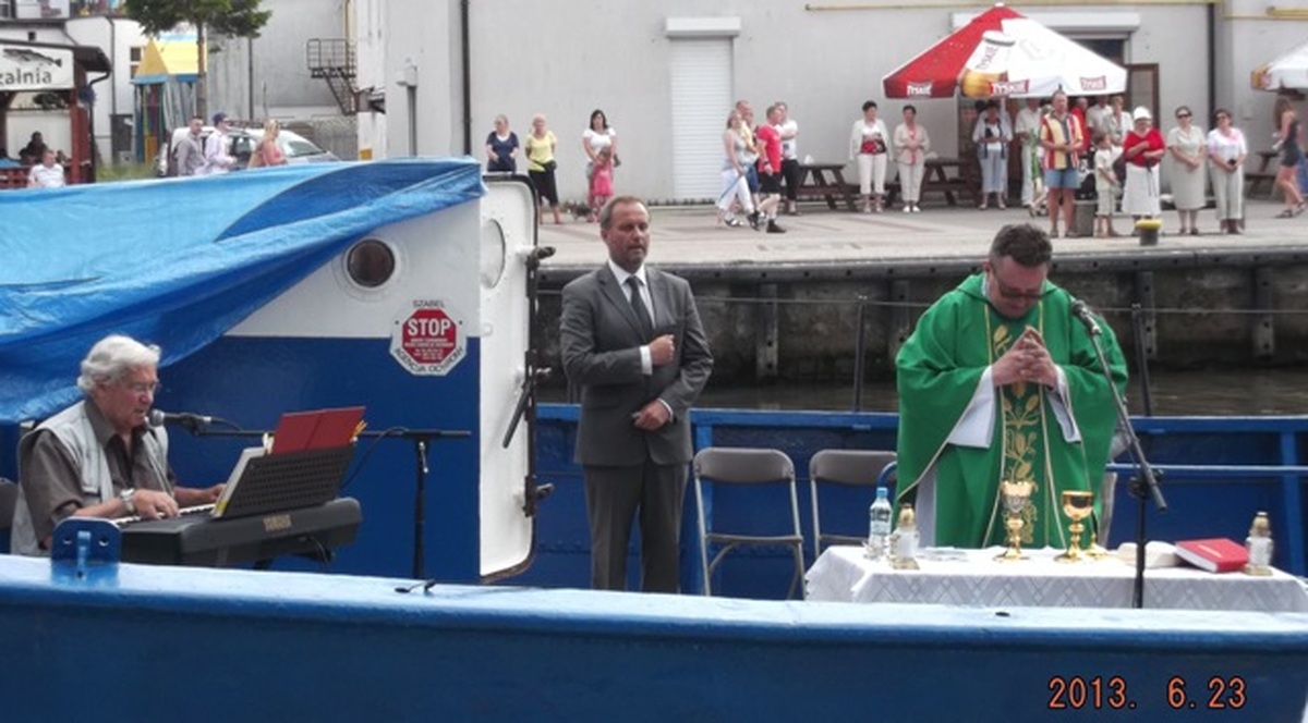 Na zacumowanym przy rozsuwanym moście i figurze Matki Boskiej szkolnym statku Zespołu Szkól Morskich M/T Franek Zubrzycki 23 czerwca z okazji Dni Morza odbyła się msza święta w intencji ludzi morza.