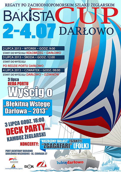 Już w najbliższą środę (tj. 3 lipca) serdecznie zapraszamy do Darłowa, gdzie odbędzie się wyścig o Błękitną Wstęgę Darłowa organizowany w ramach Bakista Cup - Regat po Zachodniopomorskim Szlaku Żeglarskim. Jak nas poinformował generalny organizator regat - Piotr Stelmarczyk na listach startowych widnieje 35 jachtów, na pokładach których płynie 101 żeglarzy. W dniu dzisiejszym, załogi te rywalizują ze sobą na trasie: Świnoujście - Kołobrzeg, 2 lipca: Kołobrzeg - Darłowo. W środę (3.07), w samo południe zmagać się będą w wyścigu po redzie portu Darłowo rywalizując ze sobą o Błękitną Wstęgę Darłowa - nagrodę Burmistrza Darłowa. Zapraszamy do kibicowania i dopingowania załóg żeglarskich - 3 lipca, godz. 12:00 - Port Darłowo. Wyścig obserwować będzie można z plaż oraz falochronów portowych. Natomiast o godzinie 18:00 w Porcie Jachtowym Darłowo - ul. Conrada 27 odbędzie się uroczystość dekoracji zwycięzców, koncert szant w wykonaniu darłowskiej grupy „Niezbędny Balast" oraz muzyki folkowej - Zgagafari. Serdecznie zapraszamy mieszkańców Darłowa, regionu oraz Turystów do wspólnej zabawy w żeglarskim klimacie.