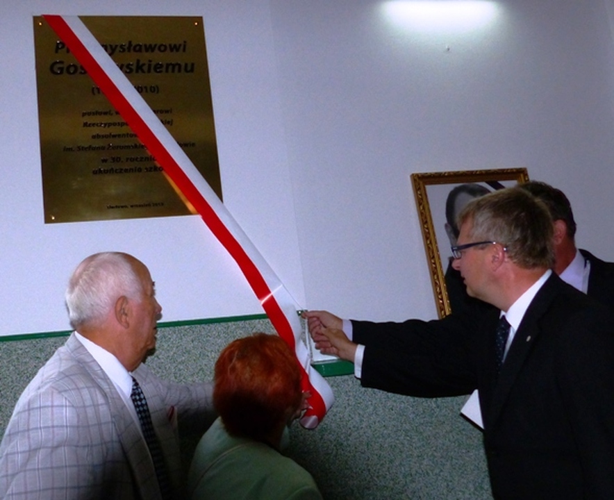 Przemysław Gosiewski urodził się 12 maja 1964 w Słupsku, zginął 10 kwietnia 2010 w katastrofie smoleńskiej. Młodość spędził w ukochanym Darłowie, gdzie do tej pory mieszkają jego rodzice Jan i Jadwiga Gosiewscy. Po ukończeniu Szkoły Podstawowej nr 3 uczęszczał do Liceum Ogólnokształcącego im. Stefana Żeromskiego. Był laureatem olimpiad przedmiotowych z geografii i historii. Maturę zdał w roku 1983. Po ukończeniu liceum kontynuował studia na wydziale prawa i administracji Uniwersytetu Gdańskiego. Tablicę odsłonili rodzice Przemysława razem z Arkadiuszem Klimowiczem burmistrzem miasta Darłowa. Podczas ceremonii zabrał głos Jan Gosiewski, który dziękował władzom miasta za upamiętnienie syna i dodał, aby tablica łączyła nasze społeczeństwo dla dobra kraju, a nie dzieliła. Pedagogom życzył dalszych sukcesów w wychowaniu młodzieży. Włodarz miasta, który był szkolnym kolegą Przemysława Gosiewskiego-powiedział, że nawet z małego miasta można zostać wybitną osobistością, dzięki swoim zdolnościom i pracowitości, czego najlepszym przykładem był Przemysław Gosiewski.