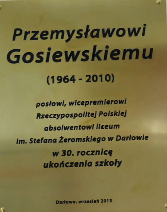 W 30 rocznicę ukończenia liceum przez Przemysława Gosiewskiego darłowski samorząd ufundował okolicznościową mosiężną tablicę o treści: „Przemysławowi Gosiewskiemu (1964-2010) posłowi, wicepremierowi Rzeczypospolitej Polskiej absolwentowi liceum im. Stefana Żeromskiego w Darłowie w 30. rocznicę ukończenia szkoły. Darłowo, wrzesień 2013”