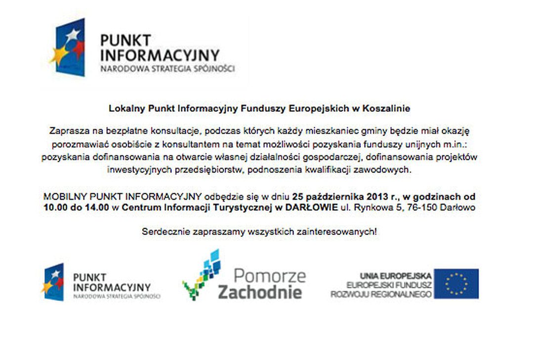 Mobilny Punkt Informacyjny odbędzie się w dniu 25 października 2013 r., w godzinach 10:00 -14:00 w Centrum Informacji Turystycznej w Darłowie przy ul. Rynkowej 5.