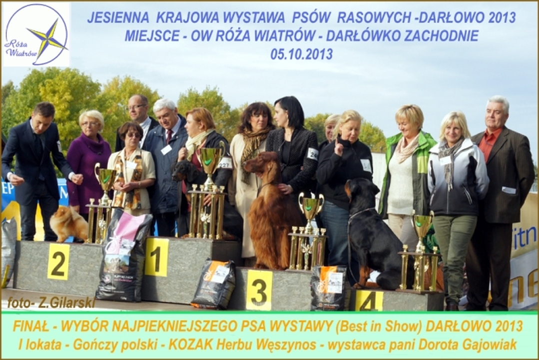 W wystawie wzięło udział 400 psów reprezentujących ponad sto ras. Byli równiez wystawcy z Niemiec, Ausstralii i Tajlandii. Przygotowania do organizacji tak okazałej wystawy trwały ponad pół roku mówił-międzynarodowy sędzia kynologiczny-Zbigniew Gilarski - główny organizator tej Krajowej Wystawy.  To dzięki niemu i jego inicjatywie ta wystawa odbyła się w Darłowie. Komitetem organizacyjnym kierowała Dorota Jakubowska, a komisarzem wystawy była Bożena Więckowska – Sieńko. Wystawcom i widzom dopisała pogoda. W naturalnym otoczeniu dobrze czuły się psy. Konkurencję finałową, czyli Best In show-DARŁOWO 2013, wygrał doskonały anatomicznie i dobrze wyszkolony pies rasy gończy polski o nazwie KOZAK Herbu Węszynos, wystawca - Dorota Gajowiak. Drugą lokatę zdobył szpic miniaturowy (Pomeranian). Trzecie miejsce wywalczył dobrze zbudowany seter irlandzki ARGO Rysi Wykrot.   Na zakończenie ze wszech miar udanej wystawy puchary i nagrody wręczali osobiście Wojciech Wiśniowski-starosta powiatu sławieńskiego i Krzysztof Walków – sekretarz Urzędu Miejskiego w Darłowie. Organizatory serdecznie dziękują samorządowi powiatu sławieńskiego i miasta Darłowa, wolontariuszom z Darłowskiego Centrum Wolontariatu, a szczególnie Henrykowi Uklei za gościnę, sponsorowanie i pomoc w organizacji wystawy.