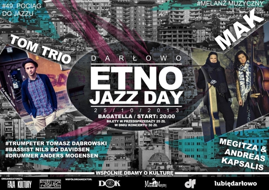Po raz pierwszy połączone zostaną dwie niezależne imprezy dla wspólnego celu - włączenia mieszkańców w kulturę! Pociąg do Jazzu oraz Melanż Muzyczny to muzyczne wydarzenia istniejące u nas od kilku lat, a propozycje obu imprez to często światowy poziom dosłownie na "wyciągniecie ręki". Kilkadziesiąt przeróżnych zespołów i setki muzycznych autorytetów z Polski, Danii, Niemiec, USA, Francji, Ukrainy... to oni promują Darłowo na kulturalnej mapie świata. Rozwój kultury w mieście zależy od wszystkich, którzy zechcą z niej korzystać, a dobrym do tego impulsem niech będzie piątkowy wieczór i dwie wspaniałe propozycje – Tom Trio czyli wybitny trębacz Tomasz Dąbrowski i jego duńska sekcja - Nils Bo Davidsen i Anders Mogensen oraz Duet MAK : Magitza (finalistka programu Must Be The Music), wokalistka i kontrabasistka rodem z Podhala oraz Andreas Kapsalis - genialny gitarzysta z Chicago, wspólnie tworzą Duet MAK.
