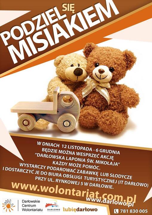 Z okazji tego święta Darłowskie Centrum Wolontariatu zwraca się z prośbą do ludzi dobrej woli, którzy pragnęliby przyczynić się do organizacji i wsparcia Darłowskiej Laponii Świętego Mikołaja. Mikołajkowi wolontariusze potrzebują wsparcia w przygotowaniu upominków dla najmłodszych dzieci. Każda ilość pozyskanych drobnych prezentów (np. misiak, resorak, klocki, puzzle) oraz każda ilość słodyczy ogromnie by nam pomogła – i na pewno wywoła uśmiech na twarzy obdarowanego dziecka. Podziel się dobrem na święta. Inni nie mają tego – co masz ty a przecież z dobrem Ci do twarzy.