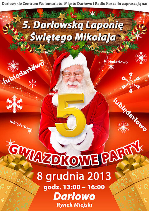 Darłowskie Centrum Wolontariatu ma zaszczyt zaprosić na wyjątkową, przedświąteczną - 5. Darłowską Laponię Świętego Mikołaja. Odbędzie się ona w niedzielę, 8 grudnia 2013 roku - tradycyjnie na darłowskim rynku - Plac Tadeusza Kościuszki.