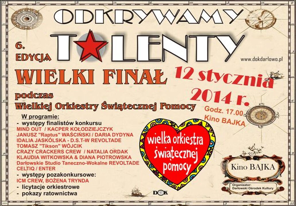 Z okazji WOŚP Darłowski Ośrodek Kultury zaprasza na: Wielki Finał 6. Edycji Odkrywamy Talenty, który odbędzie się 12 stycznia 2014 w kinie "Bajka" w Darłowie, początek o godz. 17:00 . W programie: występy finalistów konkursu (Mind Out / Kacper Kołodziejczyk, Janusz "Raptus" Waściński / Daria Dydyna / Idalia Jaskólska - D.S.T - W Revoltade / Tomasz "Tikson" Wójcik / Crazy Crackers CREW / Natalia Ordak / Klaudia Witkowska & Diana Piotrowska / Darłowskie Studio Taneczno-Wokalne Revoltade / Celtiq / ENTER