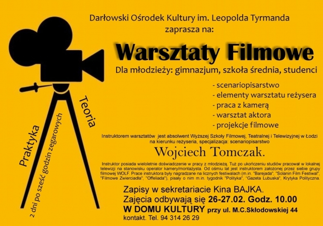 W środę i czwartek polecamy uwadze warsztaty filmowe z Wojciechem Tomczakiem, absolwentem Wyższej Szkoły Filmowej, Teatralnej i Telewizyjnej w Łodzi.