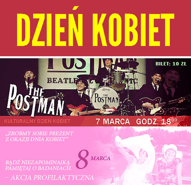 Z okazji zbliżającego się Dnia Kobiet, Darłowski Ośrodek Kultury serdecznie zaprasza do wzięcia udziału w koncertowym wieczorze polskich Beatlesów - w wykonaniu grupy The Postman, grającej i śpiewającej najbardziej znane przeboje chłopaków z Liverpool. Bilet na to wydarzenie w cenie 10 zł dostępny w darłowskim Kinie Bajka (ul. Morska 56). Koncert zrealizowany zostanie w ramach Kulturalnego Dnia Kobiet i rozpocznie się o godzinie 18:00, 7 marca w Kinie Bajka.