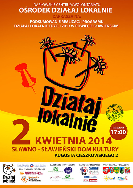 Darłowskie Centrum Wolontariatu, jako Ośrodek Działaj Lokalnie ma przyjemność zaprosić grantobiorców, darczyńców, partnerów i wszystkich zainteresowanych na uroczyste podsumowanie realizacji Programu Działaj Lokalnie edycji 2013 w powiecie sławieńskim. Uroczystość ta odbędzie się w Sławieńskim Domu Kultury (SDK - ul. A. Cieszkowskiego 2 w Sławnie), 2 kwietnia 2014 roku o godzinie 17. W programie m.in.: projekcja filmu promocyjnego Programu „Działaj Lokalnie", prezentacja efektów zrealizowanych projektów edycji 2013 oraz rozstrzygnięcie konkursu „OPOWIEDZ...". Ponadto zostaną wręczone podziękowania partnerom strategicznym i darczyńcom Programu. Wieczór urozmaici program artystyczny przygotowany przez Sławieński Dom Kultury. Zapraszamy.