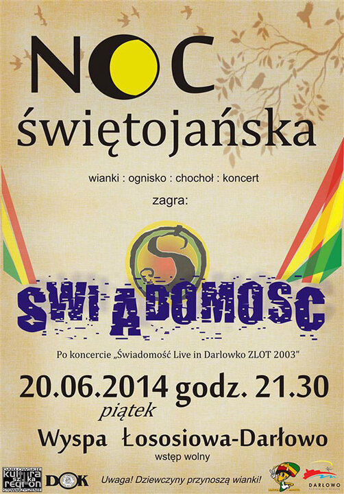 Darłowskie Stowarzyszenie Kultura Sztuka Region 20 czerwca br. (tj. piątek) zaprasza na Noc Świętojańską, która odbędzie się na Wyspie Łososiowej w Darłowie (ul. M.C. Skłodowskiej). Impreza rozpocznie się o godz. 21.30. Najkrótszą noc w roku umilać nam będzie po raz pierwszy podczas Nocy Kupały zespół „Świadomość". Niespodzianką będzie występ solowy młodej piosenkarki z Darłowa.