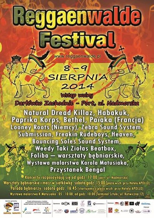 Międzynarodowy Festiwal startuje w piątek 8 sierpnia. Tego dnia na scenie muzycznej zagrają: 17.00-HEAVEN, 18.30-BETHEL, 20.30-PAPRIKA KORPS, 22.15 - HABAKUK.00.00- SUBMISSION (w namiocie, sound system). Już tradycją jest, że na Reggaenwalde odbywa się parada bębniarzy mówi Robert Gorgol – główny organizator Festiwalu i prezes stowarzyszenia Kultura Sztuka Region. W tym roku startujemy w sobotę o godz. 16.45 z plaży przy Hotelu Apollo. A wcześniej od godz. 15.00 warsztaty bębniarskie, które poprowadzi zespół FOLIBA. Zapraszamy wszystkich z instrumentami na plażę. Mogą to być: bębny, grzechotki i inne pomagajki - nawet te własnoręcznie zrobione. Tradycyjnie zapraszamy również do degustacji dań wegetariańskich na Przystanku Bengal. Dochód ze sprzedaży potraw będzie przeznaczony na charytatywny cel. W sobotę 9 sierpnia godz. 15.00 -Warsztaty bębniarskie i mecz w siatkówkę. Plaża przy Apollo, godz. 16.45 -Parada Bębniarzy. Ruszamy spod Hotelu Apollo (od strony plaży)