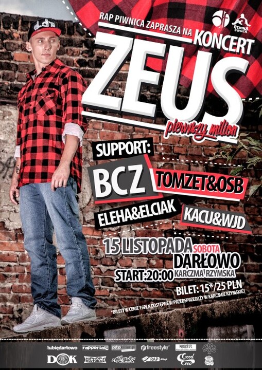 Z kolei w sobotę, 15 listopada o godz. 20:00, zapraszamy na kolejną edycję projektu Rap Piwnica. Tym razem piwnice lokalu Karczma Rzymska odwiedzi łódzki raper Zeus. To muzyczne wydarzenie zostanie również wzbogacone o support w wykonaniu BCZ-eta, Eleha, Elciaka, ToMZeta, oSb oraz darłowskich reprezentantów Kaca i WJD.