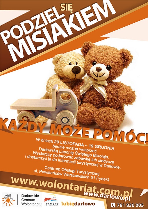 Darłowskie Centrum Wolontariatu zwraca się z prośbą do ludzi dobrej woli, którzy pragnęliby przyczynić się do organizacji i wsparcia Darłowskiej Laponii Świętego Mikołaja. Potrafimy powiedzieć otwarcie czego nam potrzeba, gdyż dobrze znamy potrzeby naszych odbiorów. Każda ilość pozyskanych drobnych prezentów (np. misiak, resorak, klocki, puzzle) oraz każda ilość słodyczy ogromnie by nam pomogła - i na pewno wywoła uśmiech na twarzy obdarowanego dziecka. Nie bądź egoistą, podziel się dobrem na święta. Inni nie mają tego - co masz ty a przecież z dobrem Ci do twarzy.