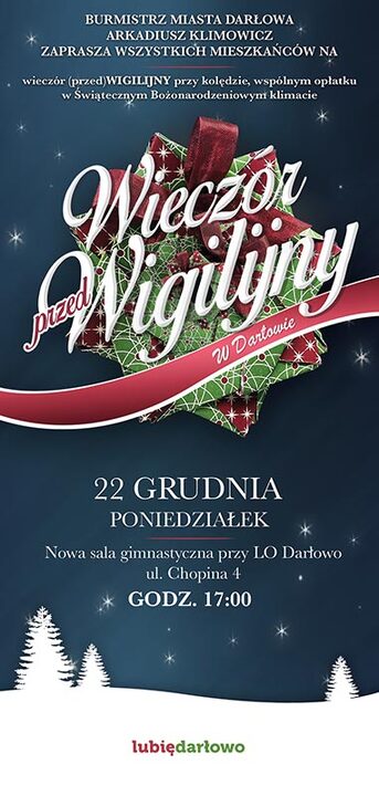 Burmistrz Darłowa - Arkadiusz Klimowicz zaprasza wszystkich mieszkańców Darłowa, na wyjątkowy Wieczór (przed)Wigilijny. Odbędzie się on 22 grudnia br. (tj. poniedziałek) w nowej sali gimnastycznej przy Zespole Szkół im. S. Żeromskiego w Darłowie (ul. Chopina 4). Wspólne kolędowanie rozpoczniemy o godzinie 17:00. Nie zabraknie życzeń, dzielenia się opłatkiem, słodkich pierników, smaku bakalii - magii i nastroju Świąt. Zapraszamy.