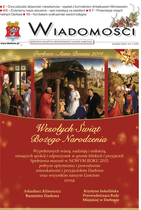 Informujemy, że w dniu dzisiejszym ukazało się najnowsze, świąteczne wydanie „Wiadomości Darłowskich" - bezpłatny biuletyn Królewskiego Miasta Darłowa - grudzień 2014 Nr 1 (137).