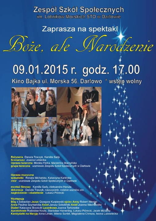 Zespół Szkół Społecznych im. Lotników Morskich STO w Darłowie zaprasza na spektakl „Boże, ale Narodzenie", który odbędzie się na deskach darłowskiego Kina Bajka w dniu 9 stycznia 2015 roku (tj. piątek). Wstęp wolny - godz. 17:00.