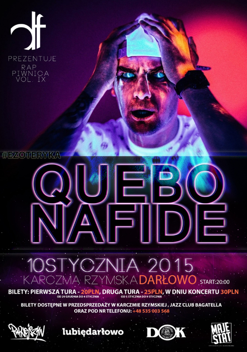 tnij.at/quebo. Zapraszamy ! 10 stycznia / Karczma Rzymska / Darłowo / Start:20:00. Bilety dostępne w przedsprzedaży w Karczmie Rzymskiej, Jazz Club Bagatela oraz pod numerem telefonu: