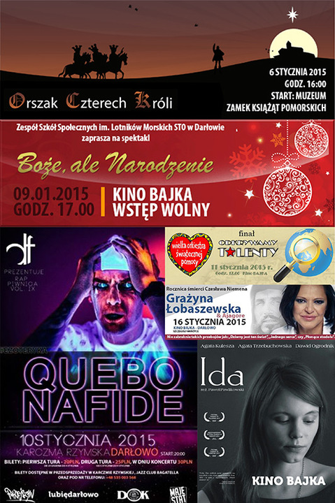 11 stycznia - Wielki finał darłowskiej 7. edycji ODKRYWAMY TALENTY, połączony z licytacjami na rzecz 23. Wielkiej Orkiestry Świątecznej Pomocy. Rozpoczęcie godzina 17:00 - Darłowo, Kino Bajka.