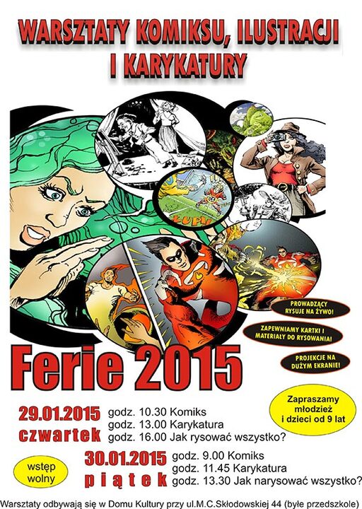 29 i 30 stycznia (tj. czwartek - piątek) w Domu Kultury przy ul. M.C. Skłodowskiej w Darłowie odbywać się będą ciekawe warsztaty komiksu, ilustracji i karykatury, na które zapraszamy wszystkich zainteresowanych, którzy ukończyli 9 rok życia.