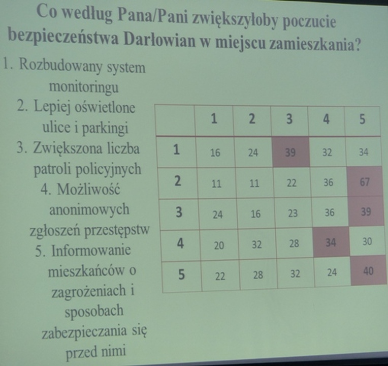 Prawie wszyscy z nich mieli swoje wystąpienia połączone z projekcjami na ekranie informujące uczestników debaty o aktualnym stanie bezpieczeństwa na swoim obszarze działania, albo zabierali głos w dyskusji. Dla przykładu podam, że podkom. Andrzej Kamoda w swoim wystąpieniu mówił szeroko o działaniach policji, aby Darłowo było bezpieczne. O tym jak widzi młodzież szkolna służby porządkowe i bezpieczeństwo w Darłowie mówili dyrektorzy poszczególnych szkół w oparciu o badania ankietowe. W swoim wystąpieniu st. sierż. Maciej Świętosławski poinformował słuchaczy n/t profilaktyki wśród młodzieży. O dobrych praktykach współpracy mieszkańców miasta ze Strażą Miejską mówił komendant darłowskiej Straży Miejskiej. Działalność Państwowej Straży Pożarnej na terenie Darłowa w roku 2014 przedstawił kpt. Krzysztof Pietruszka z-ca PSPP w Sławnie. O przemocy w darłowskich rodzinach informował przewodniczący zespołu interdyscyplinarnego Waldemar Wieczorek. Zjawisko alkoholizmu w Darłowie w świetle działań MKRPA przedstawiła Krystyna Mądry. Ponadto wystąpili: przełożona dzielnicowych i kierownik ogniwa prewencji Komisariatu Policji w Darłowie st. sierż. Karol Dąbrowski. Z podsumowania dyskusji o bezpieczeństwie w Darłowie wynika że ilość przestępstw się zmniejsza i jednocześnie rośnie ich wykrywalność. Mimo tego jest jeszcze na tym polu wiele do zrobienia. Dla przykładu podam, że ankietowani uczniowie ZSM na pytanie, czy obawiają się, że mogą stać się ofiarami przestępstw odpowiedzieli 41% raczej nie, 33% raczej tak, 18% zdecydowanie tak i 8% zdecydowanie nie. Podobnie na to pytanie odpowiedzieli uczniowie Zespołu Szkół im. S. Żeromskiego. Na inne pytanie czy był Pan/Pani świadkiem przestępstwa i czy ten fakt zgłoszony Policji uczniowie Żeromskiego odpowiedzieli: 118 że byli świadkami ale tego nie zgłosili, a jedynie 32 osoby fakt przestępstwa zgłosiły na Policję. Jako najważniejsze przyczyny przestępstw młodzież uznała: alkoholizm i narkomanię. Była to ze wszech miar pożyteczna debata.