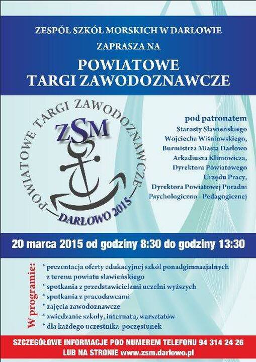 Zespół Szkół Morskich w Darłowie ma zaszczyt zaprosić uczniów klas III szkół gimnazjalnych, uczniów szkół ponadgimnazjalnych oraz nauczycieli do udziału w I Powiatowych Targach Zawodoznawczych, które odbędą się 20 marca 2015 r. Przedsięwzięcie zostało objęte patronatem Starosty Sławieńskiego Wojciecha Wiśniowskiego, Burmistrza Darłowa Arkadiusza Klimowicza, Dyrektora Powiatowego Urzędu Pracy i Dyrektora Powiatowej Poradni Psychologiczno-Pedagogicznej w Sławnie.