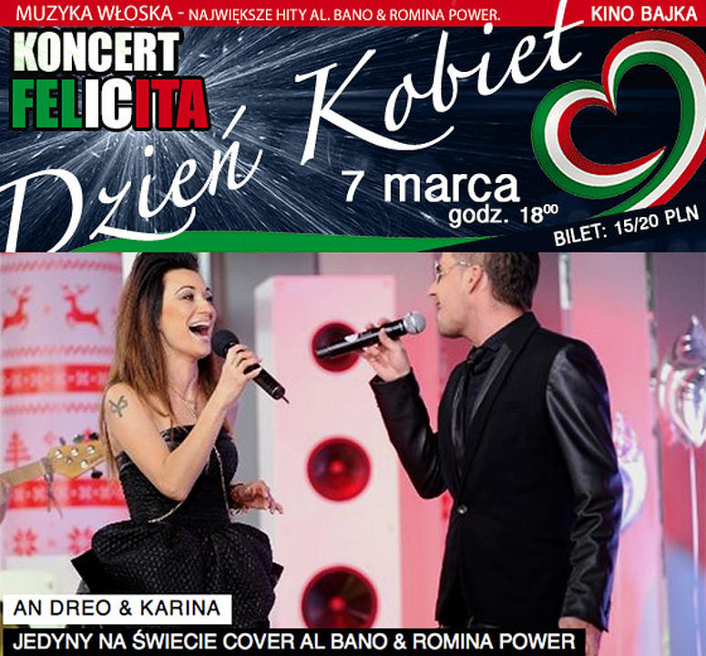 Z okazji święta Pań - Dnia Kobiet, zapraszamy do Kina Bajka, gdzie 7 marca (sobota), o godzinie 18:00 odbędzie się koncert włoskich hitów - FELICITA. Covery piosenek Al. Bano i Rominy Power wykonają dla nas laureaci Europejskiego Festiwalu Coverów - An Dreo & Karina. Bilety na to wydarzenie w cenie 15 i 20 zł do nabycia w kasie kina (ul. Morska 56).