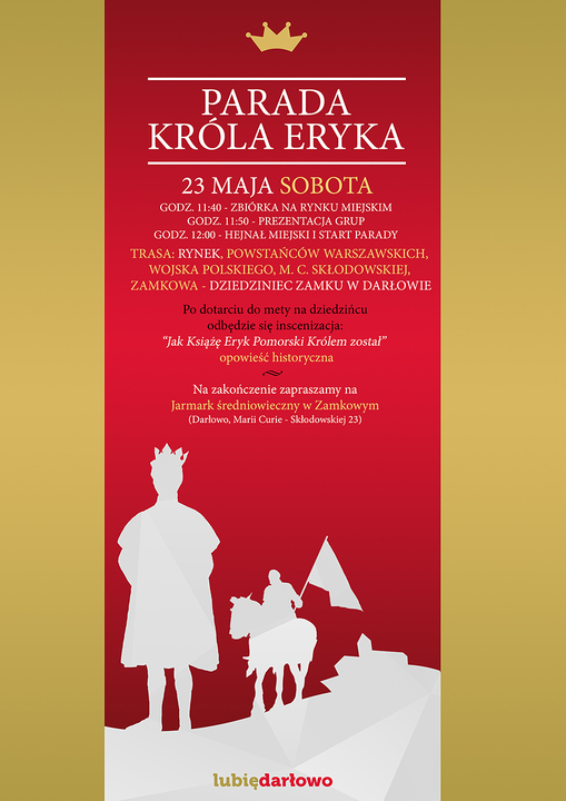 23 maja br. (tj. sobota) w ramach 703 rocznicy drugiej lokacji miasta Darłowa zapraszamy wszystkich mieszkańców, reprezentacje firm, instytucji, klubów i organizacji pozarządowych do udziału w Paradzie Króla Eryka. Rozpocznie się ona na Rynku Miejskim - zbiórką uczestników parady - godz. 11:40. Przed przemarszem, Królowi zostaną zaprezentowane grupy biorące udział w wydarzeniu. Następnie, w samo południe - tuż po miejskim hejnale Król Eryk wraz ze swoją świtą przejdą kolorową, barwną paradą głównymi ulicami miasta tj. Powstańców Warszawskich - Wojska Polskiego - Rondem Zbysława Góreckiego - M.C Skłodowskiej - Zamkową i dotrze na dziedziniec darłowskiego Zamku. Tu, w krótkiej inscenizacji Bractwo Rycerskie Ziemi Słupskiej opowie historię: „Jak Książę Eryk Pomorski Królem został". Natomiast o godzinie 13:00 przeniesiemy się do ogrodów nadwieprzańskich Zamkowego (ul. M.C. Skłodowskiej 23), gdzie będziemy wspólnie świętować urodziny miasta Króla Eryka na Jarmarku Średniowiecznym.