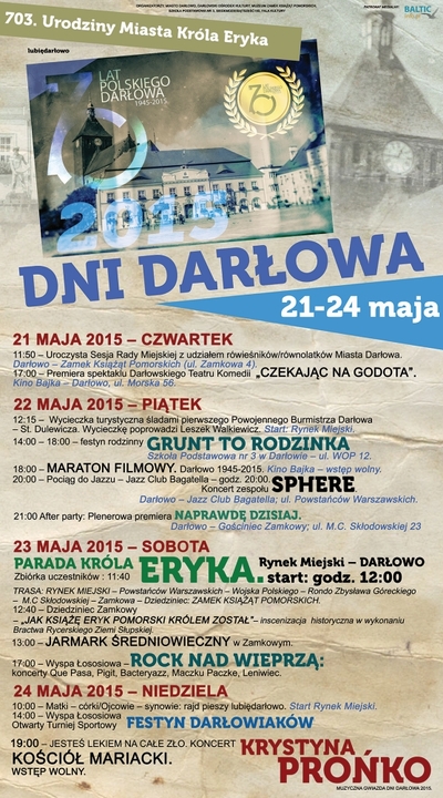 Wspólne świętowanie 703 rocznicy drugiej lokacji miasta i 70 lat Polskiego Darłowa zaczynamy w czwartek 21 maja 2015 roku następującymi wydarzeniami: