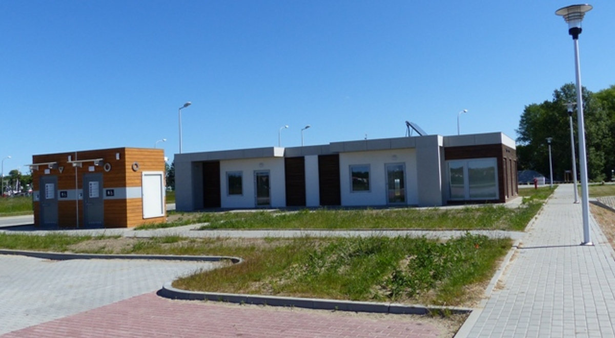 Kontenerowy budynek socjalny o powierzchni zabudowy 141,2 m kw. z rozbudowaną częścią socjalną o prysznice z ciepłą wodą ogrzewaną solarnie i toalety postawiono przy zachodniej części basenu rybackiego. Wzdłuż wschodniej części basenu rybackiego, blisko rzeki Grabowej wzniesiono halę wielofunkcyjną o powierzchni zabudowy 866,7 metra kw. i użytkowej 811,1 m oraz o wysokości 5,5 m. Do wnętrza hali prowadzą dwie wysokie podnoszone bramy. Natomiast wzdłuż południowego nabrzeża basenu postawiono dwie, hale, jedną taką samą jak od wschodu i drugą mniejszą o powierzchni zabudowy 382,4 i użytkowej 351,7 m. kw. ni wysokości 5,5 m