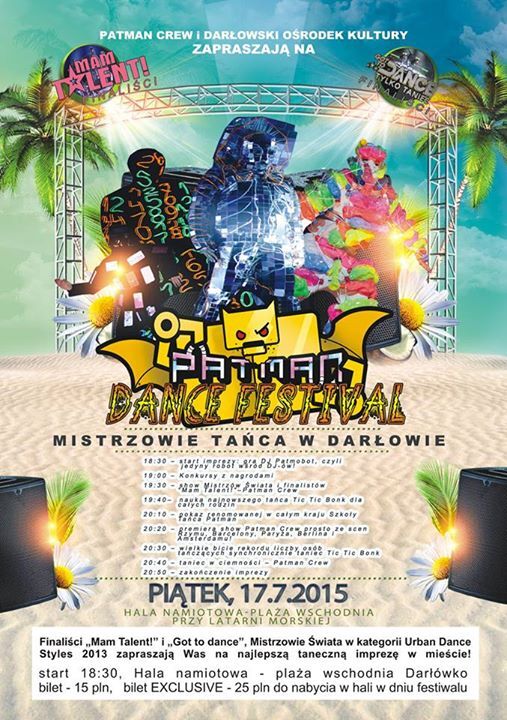 Mistrzowie tańca już dziś w Darłowie. Zapraszamy na wyjątkowe show taneczne w wykonaniu grupy PATMAN. Finaliści „Mam Talent" i „Got to dance", Mistrzowie Świata w kategorii Urban Dance Styles 2013 zapraszają na taneczną imprezę w mieście. 17 lipca 2015 - godz. 18:30. Darłówko Wschodnie - Hala Namiotowa. Impreza biletowana.