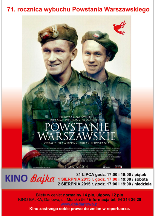1 sierpnia 2015 r. przypada 71. rocznica wybuchu Powstania Warszawskiego. Z tej okazji w najbliższy weekend w kinie Bajka pokażemy film Jana Komasy pt. "POWSTANIE WARSZAWSKIE", a także uczcimy minutą ciszy pamięć uczestników, ofiar i bohaterów Powstania w godz. W, tj. 1 sierpnia o godz. 17:00. Wydarzeniu towarzyszyć będą zaproszeni goście, władze Miasta Darłowa, Kombatanci.