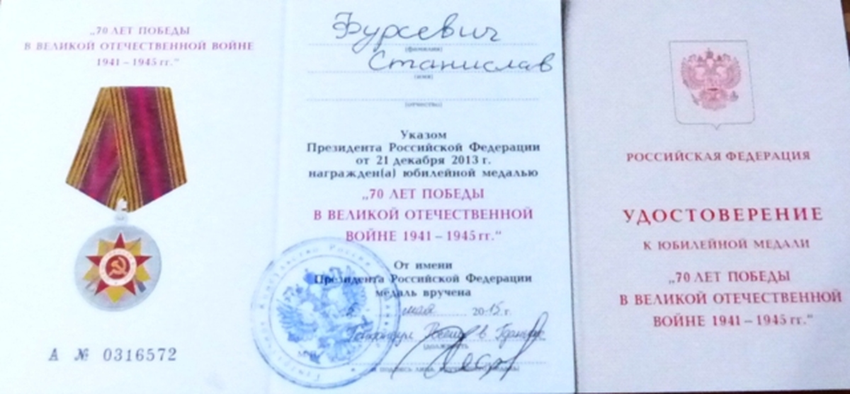 Specjalnymi medalami „70 lat Zwycięstwa w wielkiej Wojnie Ojczyźnianej 1941- 1945” uhonorowano następujących sześciu kombatantów poinformował nas Kazimierz Kuligowski prezes zarządu koła Związku Kombatantów RP i BWP: Fursewicz Stanisław, Koguciuk Jan, Kotara Jan, Jeż Zygmunt, Chalecki Ryszard i zmarły niedawno Mili Benedykt.