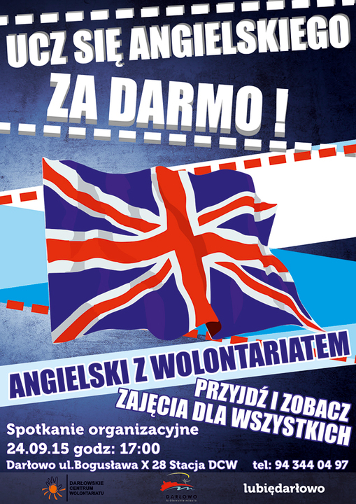 Darłowskie Centrum Wolontariatu zaprasza na spotkanie organizacyjne dla wszystkich osób zainteresowanych podjęciem nauki języka angielskiego. Bezpłatny kurs angielskiego kierowany jest do wszystkich zainteresowanych mieszkańców Darłowa oraz okolic, bez ograniczeń wiekowych. Pierwsze spotkanie organizacyjne (podział grup, rekonesans) odbędzie się 24 września br. (tj. czwartego) o godz. 17:00 w siedzibie Darłowskiego Centrum Wolontariatu na Stacji DCW przy ul. Bogusława X 28. Zapraszamy do udziału w kursie pn. Angielski z Wolontariatem.