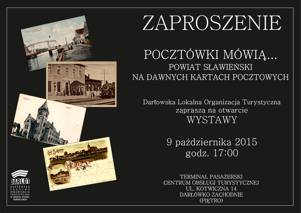 Darłowska Lokalna Organizacja Turystyczna zaprasza na otwarcie wystawy "Pocztówki mówią - Powiat Sławieński na dawnych kartach pocztowych", które odbędzie się w piątek 9 października 2015 r. o godz. 17.00 w Terminalu Pasażerskim - Centrum Obsługi Pasażerskiej przy ul. Kotwicznej 14 w Darłówku Zachodnim.