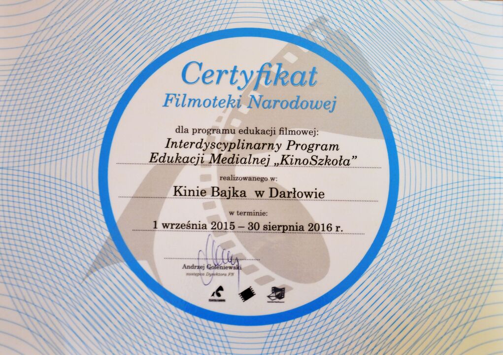 - Certyfikat Filmoteki Narodowej dla programu edukacji filmowej pn. KinoSzkoła realizowanego (min.) w kinie Bajka na rok szkolny 2015/2016 J