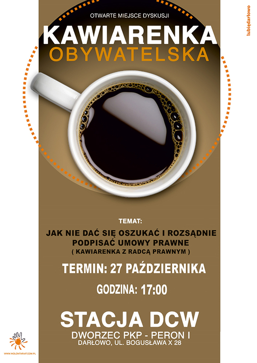 Darłowskie Centrum Wolontariatu zaprasza do udziału w Kawiarence Obywatelskiej, która odbędzie się 27 października o godzinie 17:00 na Stacji DCW. Tym razem rozmawiać będziemy o kruczkach prawnych - czyli o tym jak nie dać się oszukać i rozsądnie podpisywać umowy prawne. Do rozmowy zaprosiliśmy radcę prawnego, który będzie ekspertem w temacie i podpowie nam jak poruszać się po zawiłych paragrafach, na co zwrócić uwagę by nie dać się oszukać a umowy podpisywać z pełnym zrozumieniem ich treści.