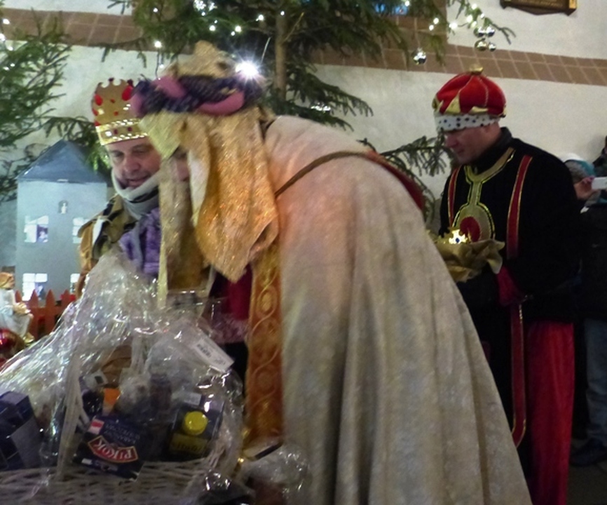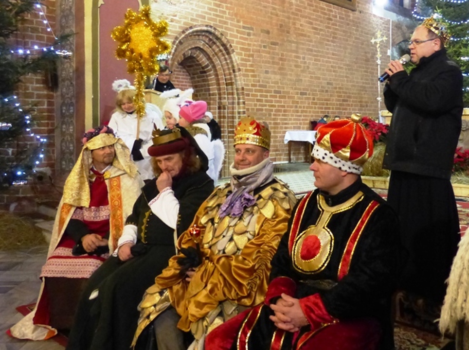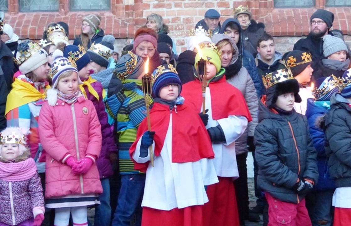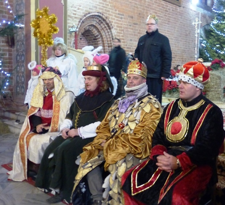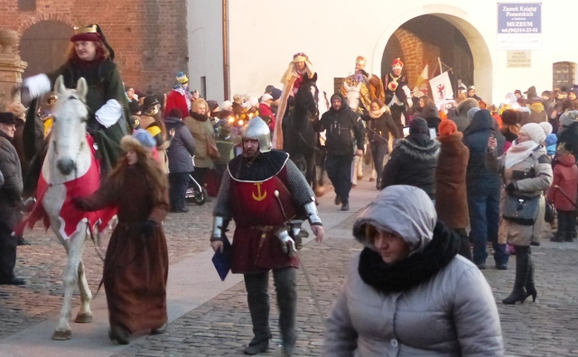 Na dziedziniec zamku króla Eryka z trzech stron świata dotarli Trzej Królowie: Kacper, Melchior i Baltazar z orszakami. W murach zamku powitał ich Eryk Pomorski czwarty król i burmistrz Darłowa - Arkadiusz Klimowicz. Na dziedzińcu zamkowym lśniło od koron, bereł, gwiazd i chorągwi. Czterej królowie na koniach wraz z orszakiem przedefilowali przez miasto z rezydencji królewskiej Eryka ulicami: Zamkowa - Podzamcze - Powstańców Warszawskich - Rynek, Plac T. Kościuszki– Kościelna –Wenedów - Kościół Mariacki. Warto wiedzieć, że w roku 2016 mija 620 lat jak Eryk Pomorski z urodzenia darłowiak został władcą Skandynawii. Królewskiemu orszakowi towarzyszyły tłumy mieszkańców. Królowie pokłonili się przed żłóbkiem i złożyli nowonarodzonemu Jezusowi Chrystusowi dary: złoto, kadzidło i mirrę. Dalej śpiewano kolędy i pastorałki przed kościelnym ołtarzem. W Czterech Króli wcielili się: o. Piotr, Arkadiusz Sip, Wojciech Polakowski i Bronisław Nowak, któremu towarzyszyło zaprzyjaźnione Bractwo Rycerskie ziemi słupskiej. Przybyłych Magów serdecznie powitał proboszcz parafii MB Częstochowskiej o. Stanisław Piankowski. W imieniu górali okolicznościową śpiewką witał władców O. Sebastian. Kolędy po białorusku śpiewał O. Paweł z Grodna, a w jednej wtórował mu O. Damian. Chór kościelny wspólnie z licznie przybyłymi mieszkańcami śpiewali kolędy i weselili się z tego niecodziennego święta. Organizatorami uroczystości byli: Miasto Darłowo, Zamek Książąt Pomorskich - Muzeum w Darłowie i parafia MB Częstochowskiej.