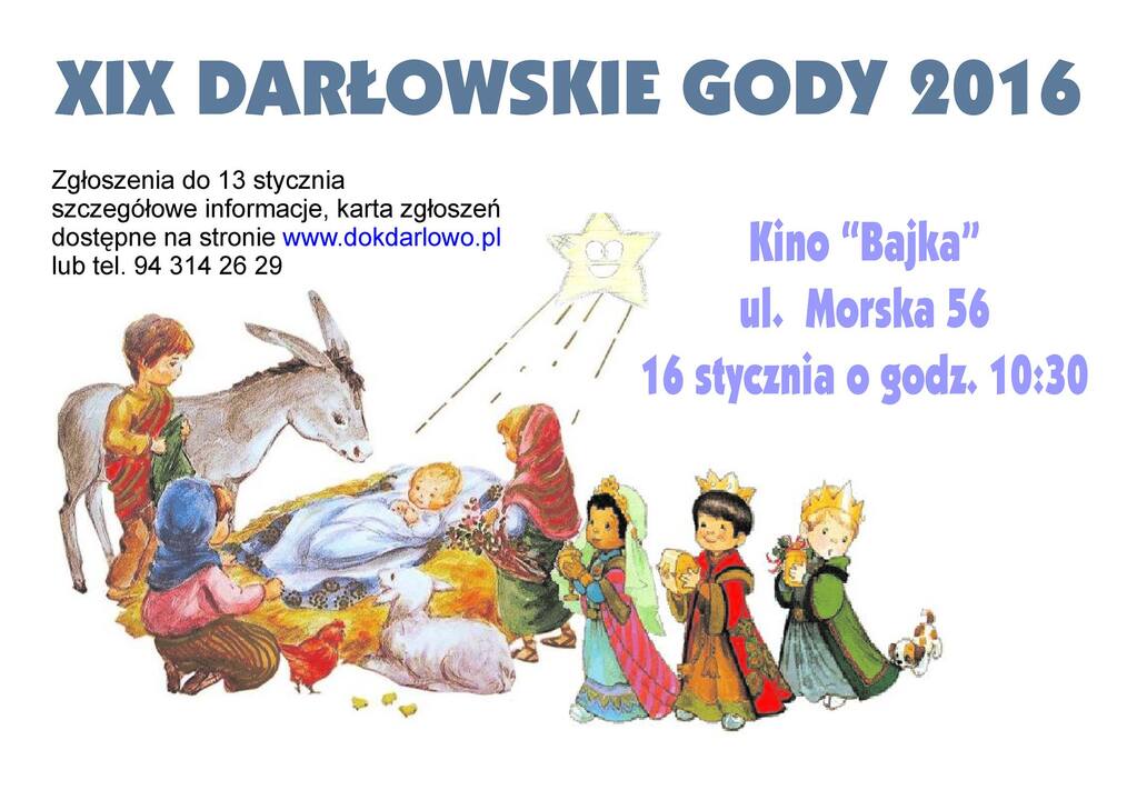 Darłowski Ośrodek Kultury zaprasza w najbliższą sobotę - tj. 16 stycznia, do udziału w corocznym, XIX Przeglądzie Zespołów Jasełkowych i Kolędniczych pn.: Darłowskie GODY. Przegląd rozpocznie się o godzinie 10:30 w sali Kina Bajka, przy ul. Morskiej 56. Polecamy uwadze.