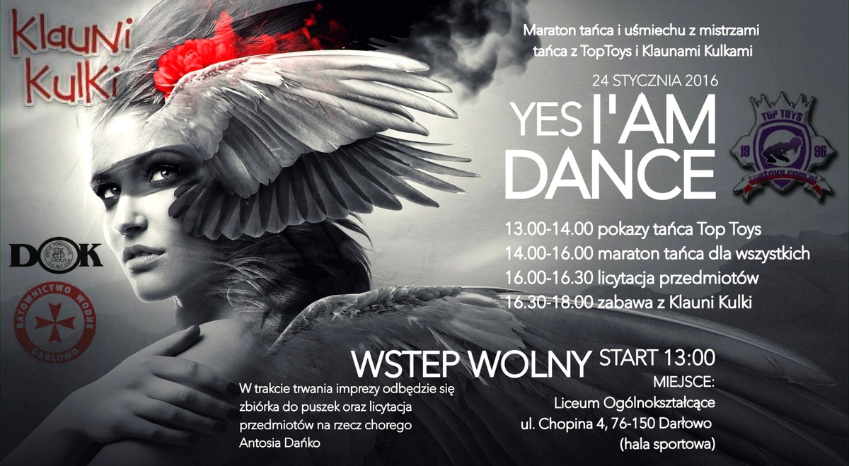Zapraszamy do udziału w wydarzeniu charytatywnym organizowanym na rzecz chorego mieszkańca Darłowa - Antosia Dańko. Maraton Tańca i Uśmiechu połączony z pokazami mistrzów tańca ze szkoły TOP TOYS, występami klaunów - odbędzie się w niedziele, 24 stycznia. Rozpoczęcie imprezy - godzina 13:00. W programie: