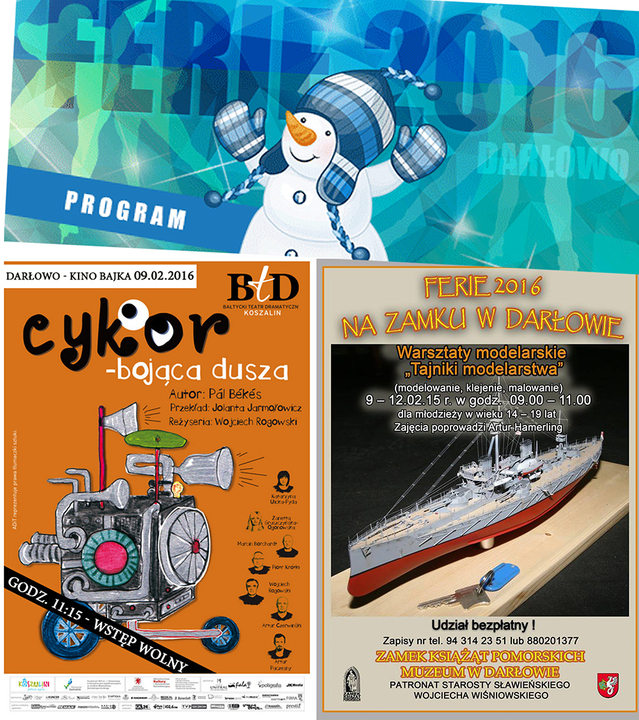 W Darłowie rozpoczyna się drugi tydzień ferii zimowych 2016. Szczególnej uwadze polecamy propozycje filmowe wyświetlane w Kinie Bajka, oblegane warsztaty handmade'u realizowane przez Darłowskie Centrum Wolontariatu, wtorkowy spektakl teatralny pt.: „Cykor" w wykonaniu aktorów Bałtyckiego Teatru Dramatycznego a także warsztaty modelarskie, które odbywają się na Zamku Króla Eryka. Wszyscy Ci, którzy pragną spędzać swój czas aktywnie powinni być zadowoleni z propozycji sportowych oferowanych przez darłowskie szkoły, klub sportowy Orlik Darłowo oraz Stocznię Darłowo. Szczegółowy program wszystkich atrakcji tegorocznych ferii opublikowaliśmy na www.darlowo.pl