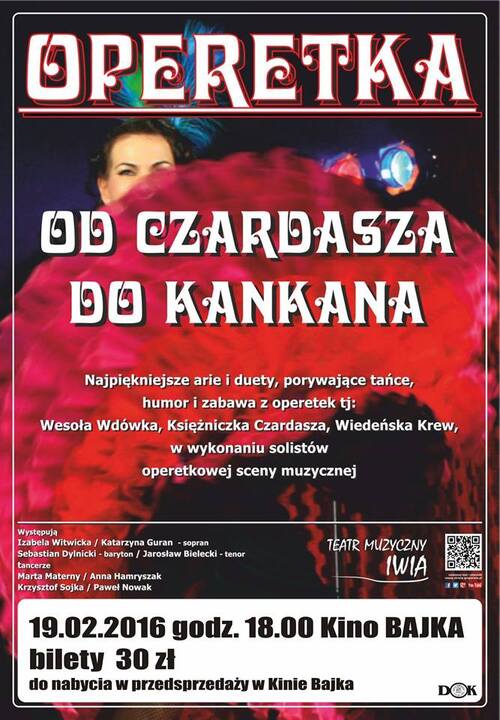 Darłowski Ośrodek Kultury wraz z Teatrem Muzycznym IWIA serdecznie zapraszają na operetkę „OD CZARDASZA DO KANKANA", która odbędzie się 19 lutego br., w siedzibie DOK - Kino Bajka ul. Morska 56 w Darłowie. Najpiękniejsze arie i duety, porywające tańce, humor i zabawa z operetek takich jak: Wesoła Wdówka, Księżniczka Czardasza, Wiedeńska krew - wszystko to w wykonaniu solistów operetkowej sceny muzycznej. Wystąpią:
