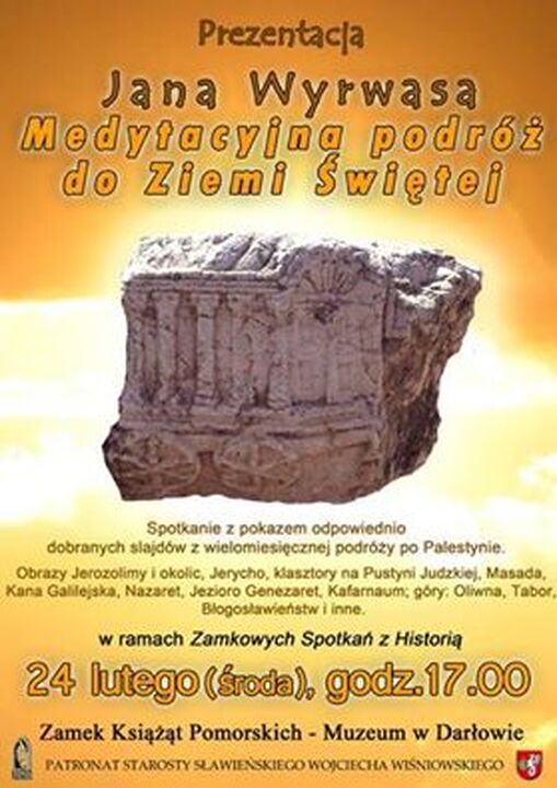 Medytacyjna Podróż do Ziemi Świętej – taki jest tytuł dzisiejszej prezentacji Jana Wyrwasa, która już o godzinie 17:00 odbędzie się na Zamku w Darłowie. Spotkanie z pokazem odpowiednio dobranych slajdów z wielomiesięcznej podróży po Palestynie. Pokazane zostaną obrazy Jerozolimy, jej okolic, Jerych, klasztory na Pustyni Judzkiej. Zapraszamy serdecznie. Spotkanie realizowane w ramach cyklicznych Zamkowych Spotkań z Historią, pod patronatem Starosty Sławieńskiego.