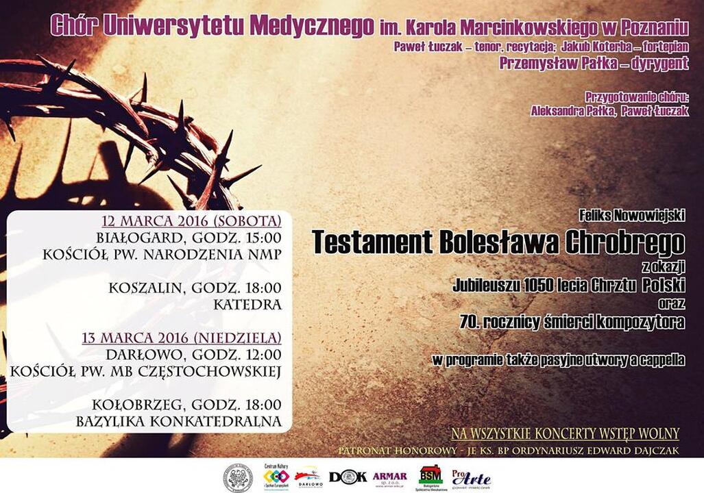 - Feliks Nowowiejski „Testament Bolesława Chrobrego” z okazji 70. rocznicy śmierci kompozytora oraz Jubileuszu 1050 Chrztu Państwa Polskiego.