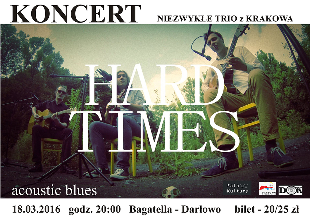 Fala Kultury i Darłowski Ośrodek Kultury mają przyjemność zaprosić na koncert niezwykłego muzycznego trio z Krakowa - HARD TIMES. Koncert odbędzie się 18 marca 2016 roku w darłowskim Klubie Bagatella przy ul. Powstańców Warszawskich. Początek imprezy - godz. 20:00. Bilety w cenie 20/25 zł