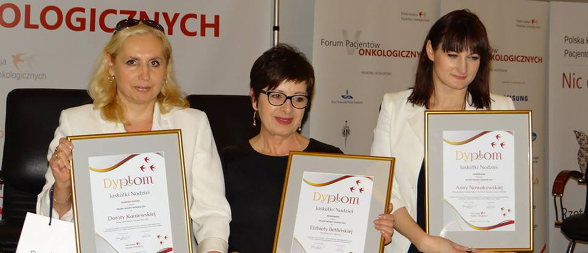 W Warszawie odbyło się - V FORUM PACJENTÓW ONKOLOGICZNYCH, gdzie wyróżnienie Jaskółki Nadziei w kat. Pacjent Niosący Nadzieję otrzymała Elżbieta Betlińska z Darłowskiego Klubu Amazonki. Gratulujemy!!!