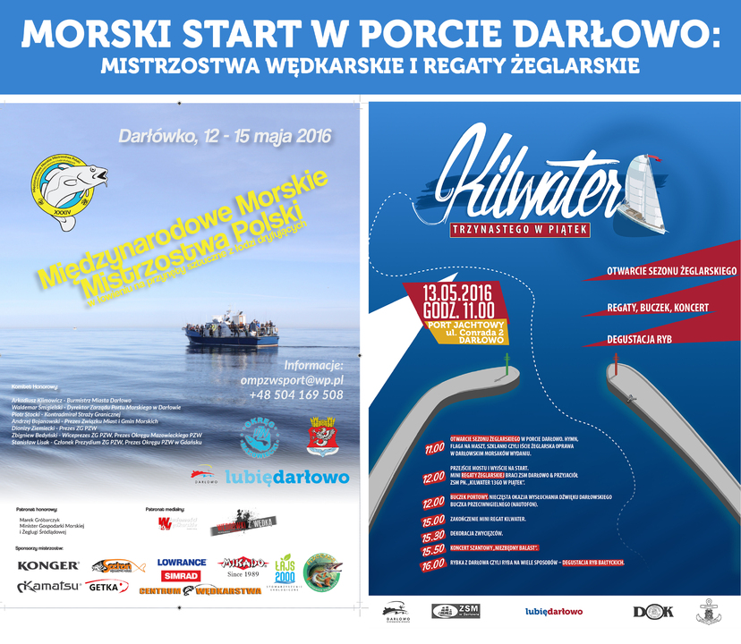 W dniach 12-15 maja 2016 roku w Darłowie odbędą się dwie imprezy o charakterze morskim. Pierwsza z nich to XXXIV Międzynarodowe Morskie Mistrzostwa Polski w Łowieniu na Przynęty Sztuczne z Łodzi Dryfujących (12-15.05.) organizowane przez Polski Związek Wędkarski Okręg Mazowiecki. Druga to Oficjalne Otwarcie Sezonu Żeglarskiego połączone z miniRegatami pn.: Kilwater 13-go w piątek, które jak nazwa mówi odbędą się 13 maja, w piątek a ich organizatorem jest Zespół Szkół Morskich w Darłowie. Zarówno w przypadku pierwszej jak i drugiej imprezy współorganizatorami są: Miasto Darłowo, Zarząd Portu Morskiego Darłowo oraz Darłowski Ośrodek Kultury.