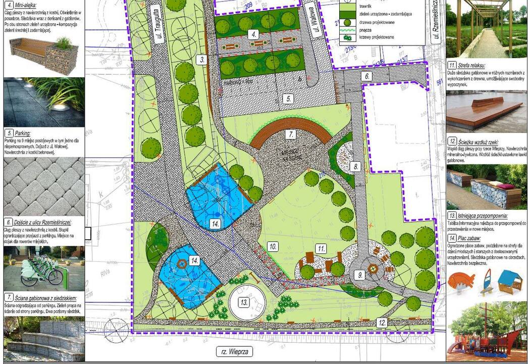 - Zakłada się wybudowanie dwóch stref zabaw dla dzieci: z urządzeniami dla dzieci młodszych i starszych. Obie strefy mają zostać ogrodzone, wyposażone w małą architekturę, a znajdujące się w niej urządzenia zabawowe zamontowane zostaną na tzw. nawierzchni bezpiecznej.