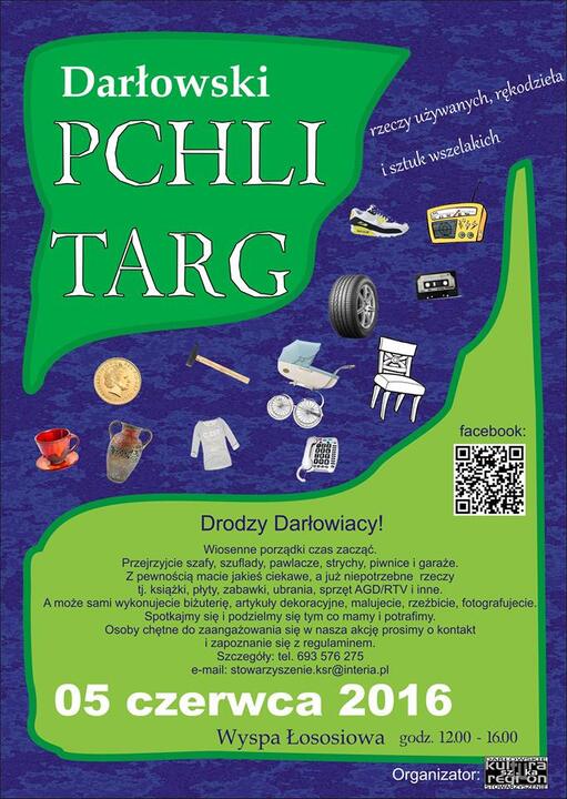 Już w najbliższą niedzielę 5 czerwca na Wyspie Łososiowej odbędzie się kolejny Pchli Targ. Rzeczy nowe, używane, sztuka wszelaka, rękodzieło to wszystko znajdziecie na darłowskim pchlim targowisku. Zajrzyjcie do szafy, piwnicy, pawlacza, a może smi znajdziecie rzeczy, którymi moglibyście się podzielić z innymi. Osoby chętne do zaangażowania się w akcje prosimy o kontakt, zapoznanie się z regulaminem i złożenie do nas karty zgłoszenia albo osobiście (Kino BAJKA, Robert Gorgol) albo internetowo (facebook, e-mail: stowarzyszenie.ksr@interia.pl)
