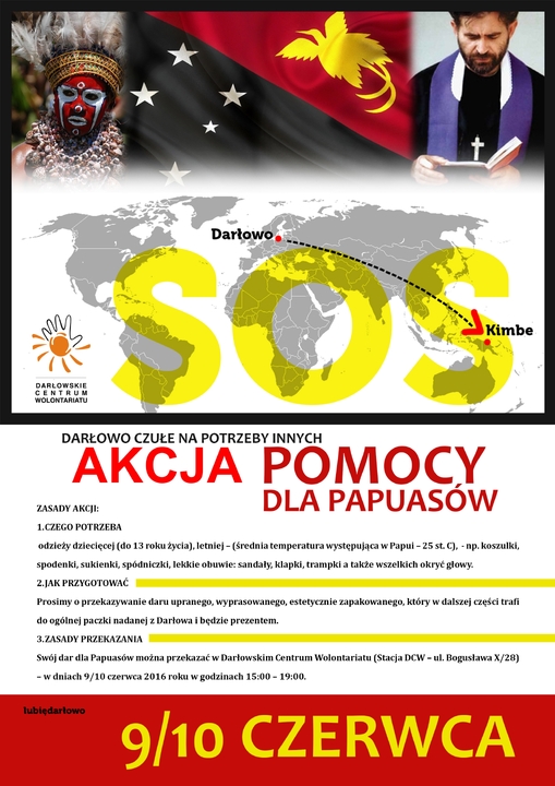 Swój dar dla Papuasów można przekazać w Darłowskim Centrum Wolontariatu (Stacja DCW - ul. Bogusława X/28) - w dniach 9/10 czerwca 2016 roku w godzinach 15:00 - 19:00.